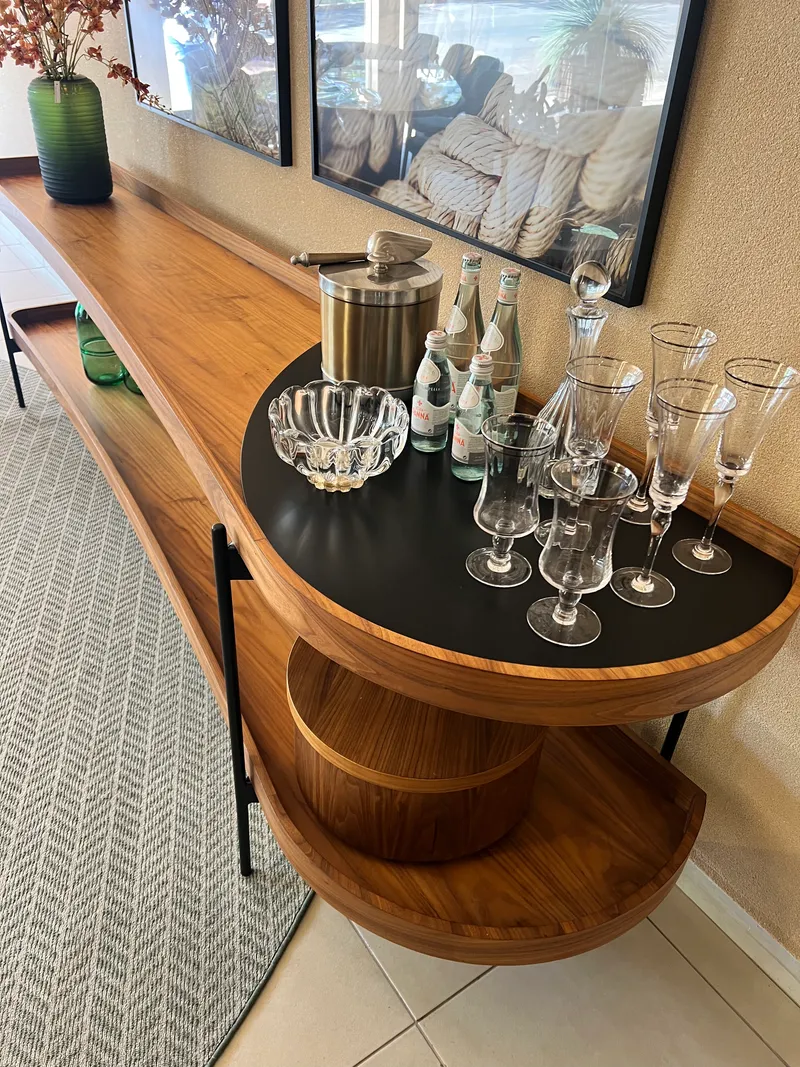 Além de funcionais, os aparadores possuem linhas elegantes e acabamentos de alta qualidade que se integram perfeitamente à proposta decorativa, garantindo um visual coeso e harmonioso. Um exemplo é o Aparador Fratelli, que não apenas serve como suporte, mas também como uma obra de arte, exibindo a elegância sutil de suas linhas e materiais.
